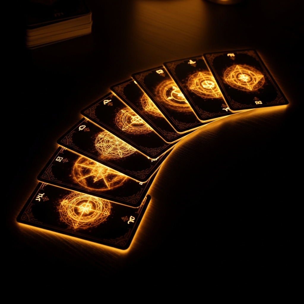 A card name appears. Four cards lie face-down before you — all identical. The card is hidden behind one of them. Close your eyes, feel the pull, and choose.